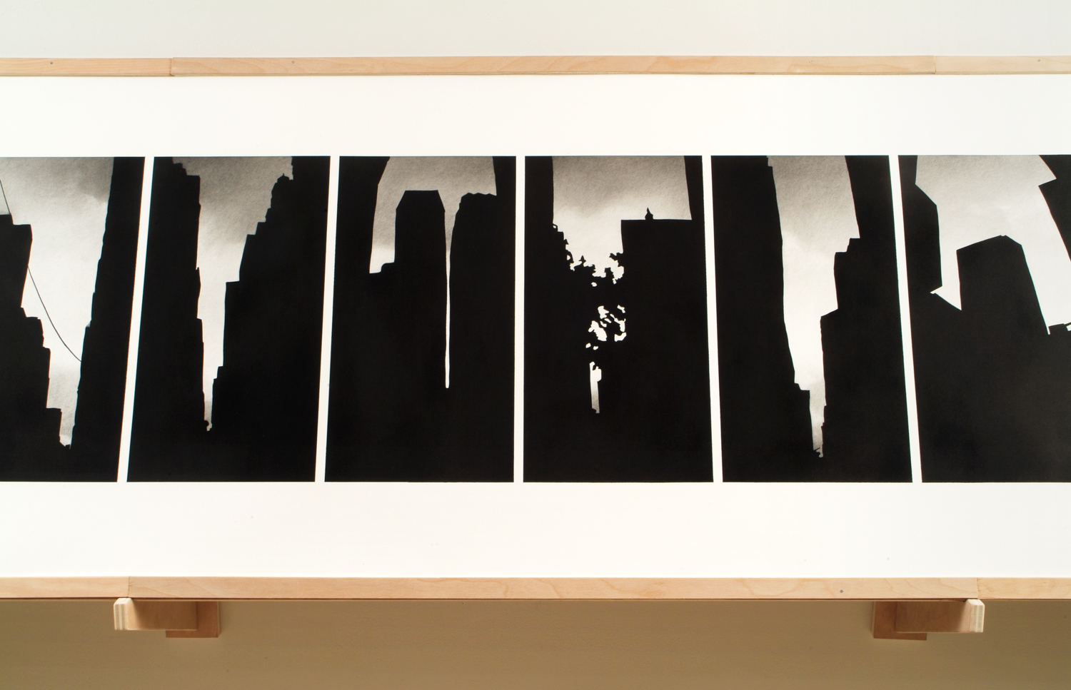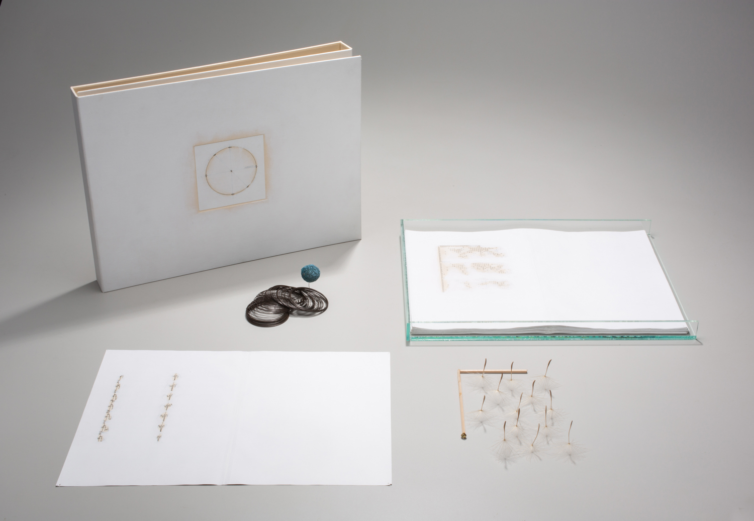 Intended to be shown as drawing portfolios, Scattered Theories are unique works comprised of altered book pages from old textbooks on meteorology, geology, life science and engineering. The text has been obscured with gesso, leaving marks that are suggestive of technical illustrations, but the subject matter is unclear. The drawings are housed in a clear acrylic box, which allows the viewer to see the stack of pages. Each box is protected with a wrap around folder and contains a title strip on the inside flap.