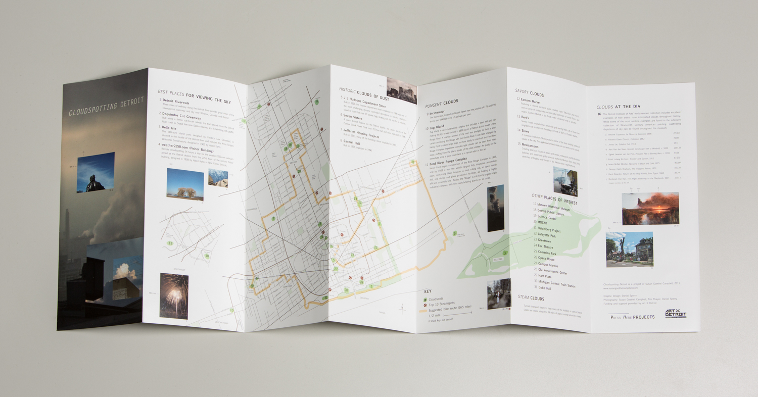 Cloudspotting Detroit, 2010, is a tourist brochure and map highlighting unique sites in the City of Detroit. Funded by Art X Detroit, the brochure has a key to identify man-made clouds and Detroit weather. In the summer, Wheelhouse Detroit sponsors a Cloudspotting bike tour highlighted in the brochure.