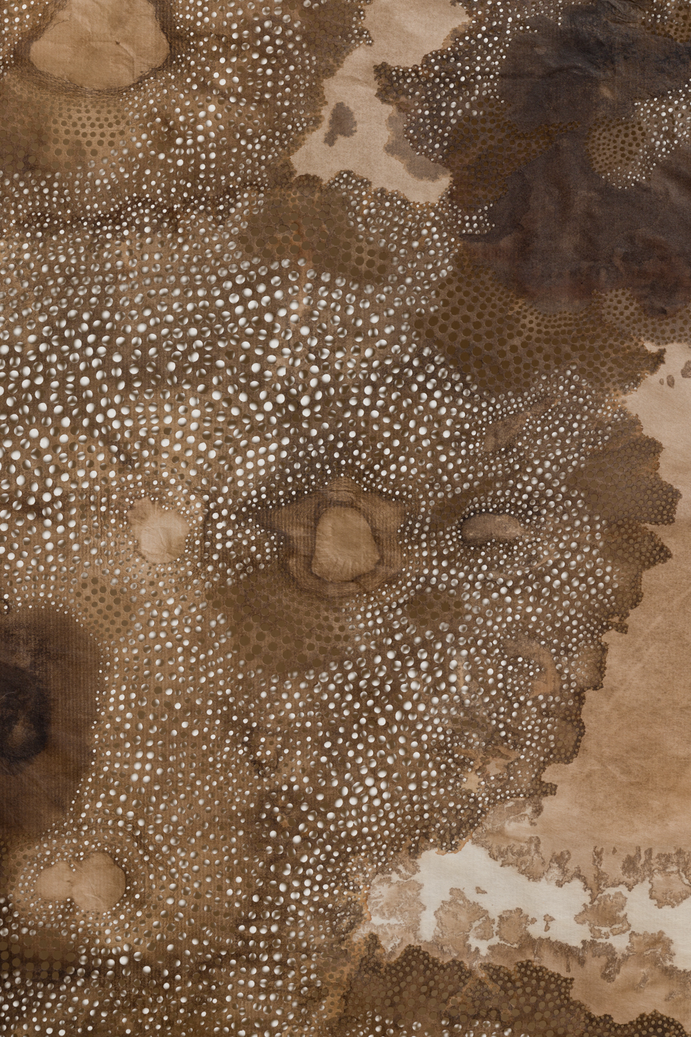 Walnut stains, sewing, hand-perforations on Japanese paper