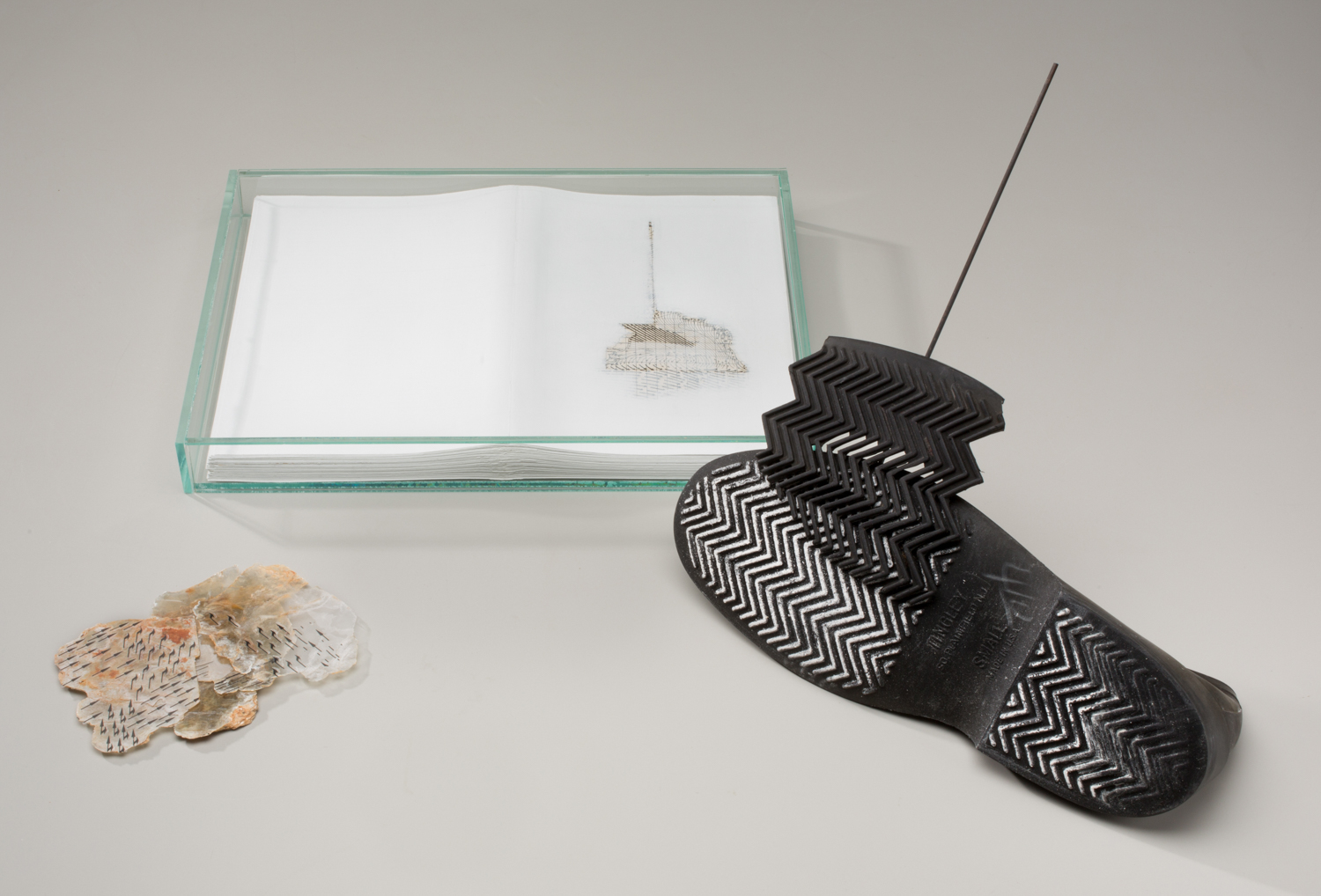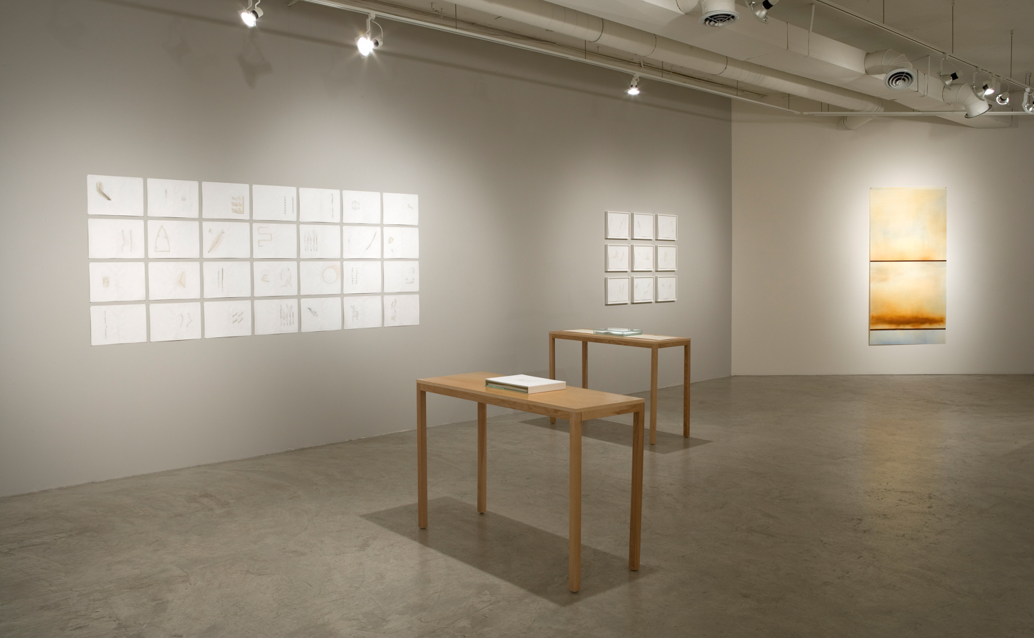 Intended to be shown as drawing portfolios, Scattered Theories are unique works comprised of altered book pages from old textbooks on meteorology, geology, life science and engineering. The text has been obscured with gesso, leaving marks that are suggestive of technical illustrations, but the subject matter is unclear. The drawings are housed in a clear acrylic box, which allows the viewer to see the stack of pages. Each box is protected with a wrap around folder and contains a title strip on the inside flap.