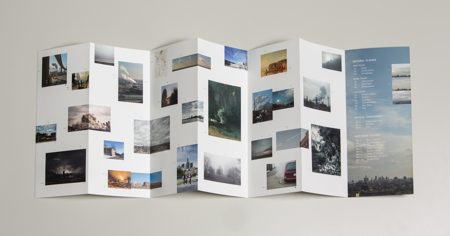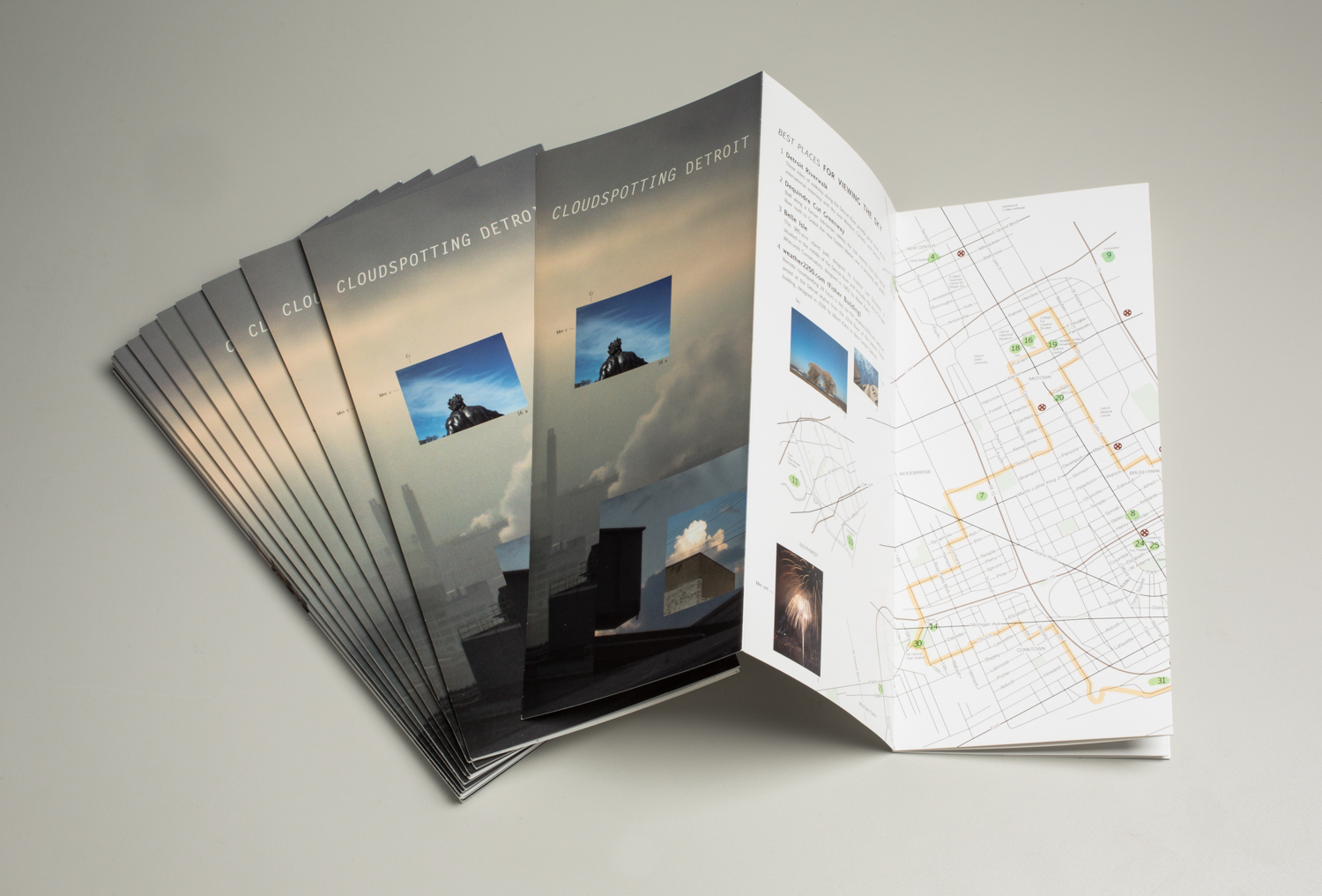 Cloudspotting Detroit, 2010, is a tourist brochure and map highlighting unique sites in the City of Detroit. Funded by Art X Detroit, the brochure has a key to identify man-made clouds and Detroit weather. In the summer, Wheelhouse Detroit sponsors a Cloudspotting bike tour highlighted in the brochure.